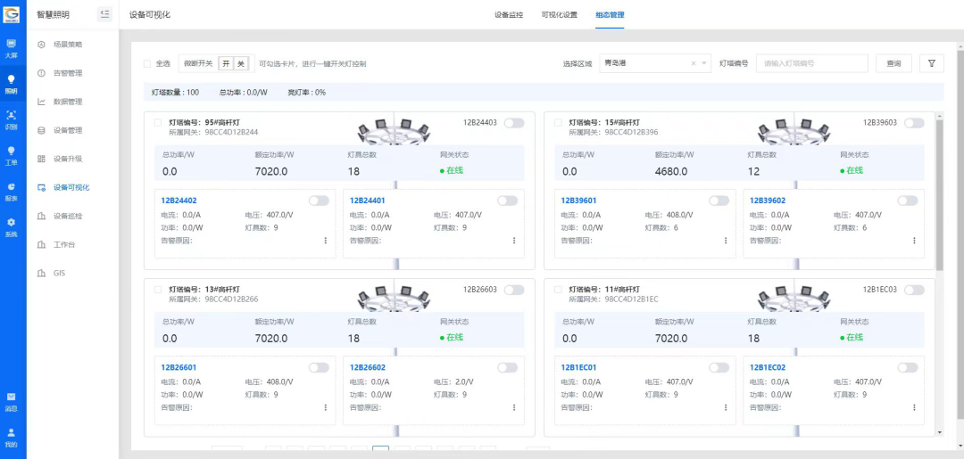 該項(xiàng)目基于港區(qū)內(nèi)需要維護(hù)的照明設(shè)施點(diǎn)多面廣分布特點(diǎn),將人機(jī)操作、遠(yuǎn)程控制、終端響應(yīng)等環(huán)節(jié)相結(jié)合,在每個(gè)變電站搭建集控中心,采用智能化無線控制技術(shù),對(duì)照明設(shè)備進(jìn)行遠(yuǎn)距離智能控制,從而實(shí)現(xiàn)對(duì)燈具的遠(yuǎn)程控制、分組控制、故障報(bào)警、壽命監(jiān)測、故障預(yù)判、按需亮燈、數(shù)據(jù)采集、報(bào)表分析等多種功能,確保隨時(shí)掌握管轄范圍內(nèi)照明設(shè)施運(yùn)行狀態(tài)的效果。